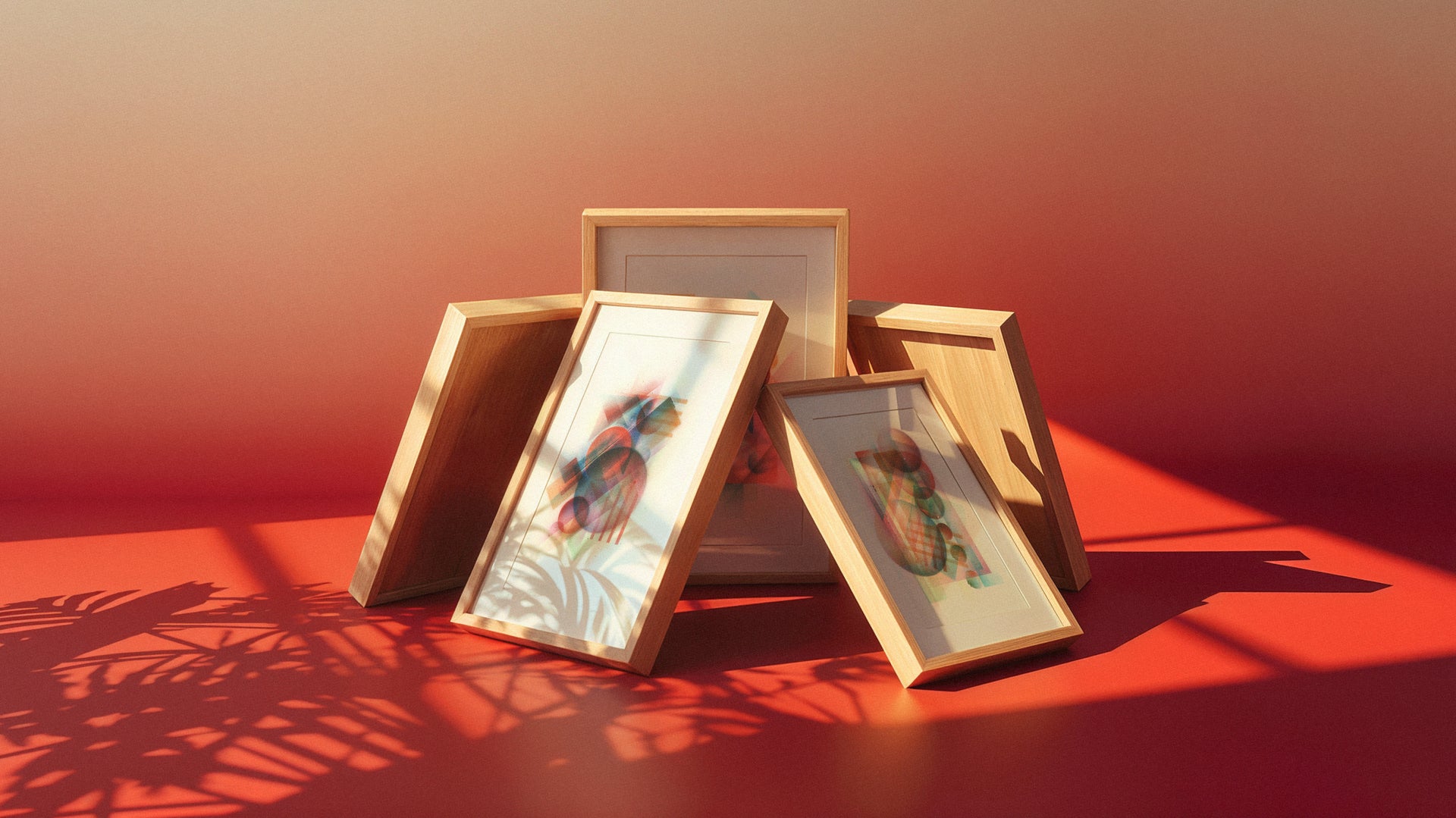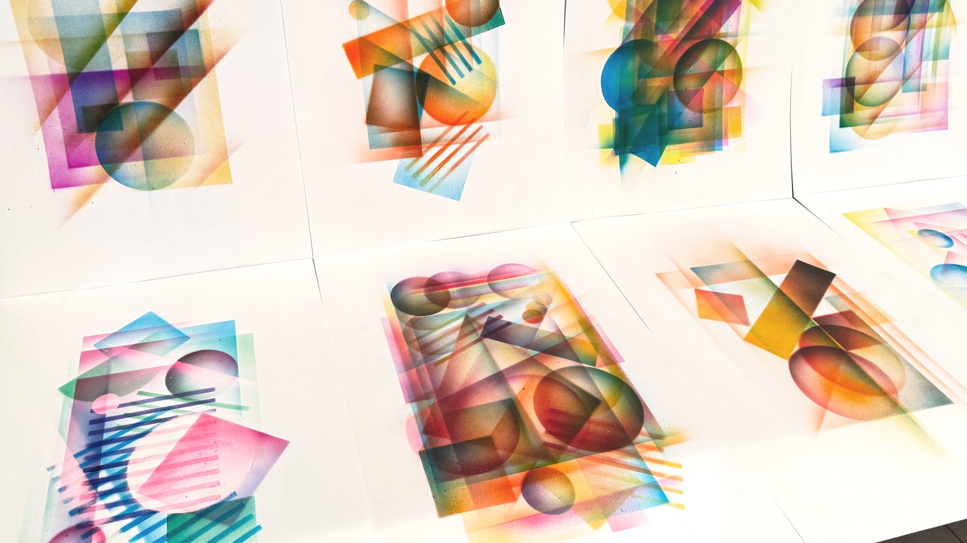 Original and unique artworks based on abstract compositions that fuse airbrush nostalgia with futuristic aesthetics through sequenced patterns and geometric shapes.